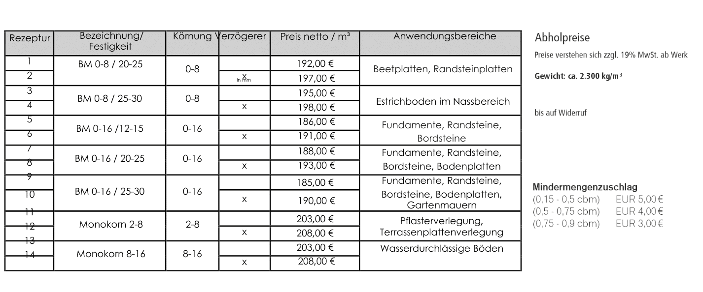 Die kleinste Abgabemenge wiegt 575 kg. Sollte Ihr Fahrzeug nicht eine entsprechende Nutzlast haben, werden wir kein Material verladen.